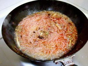 再加入泡软的粉条,加入生抽,老抽,盐,炒匀后加水没过粉条,炖1~2分钟