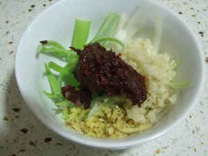 大葱切丝,姜切碎末,蒜泥备好装碗。豆瓣酱剁细,放在葱姜蒜上面。