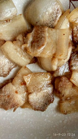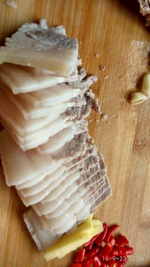 将五花肉用水煮熟,盛出待冷却,切成薄片。青椒切块备用。
