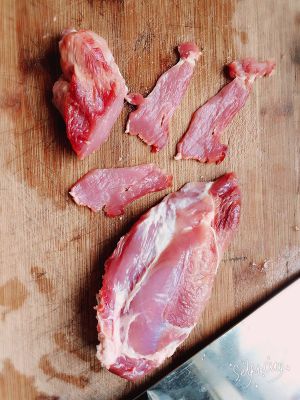 里脊肉切薄片加淀粉、胡椒粉、盐拌匀;