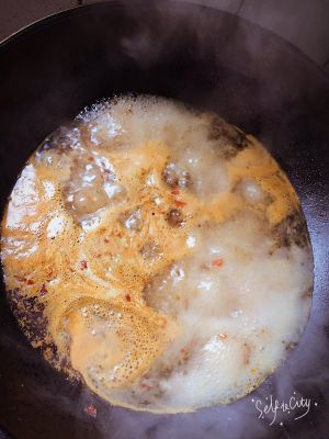 第四步:放油烧至八成热放入豆瓣酱加入开水