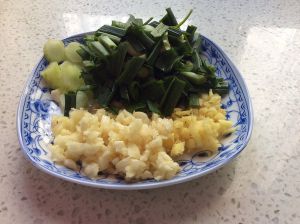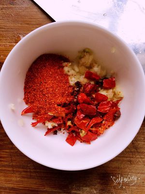 第六步:准备好辅料,姜蒜末,干辣椒,少量辣椒粉,花椒