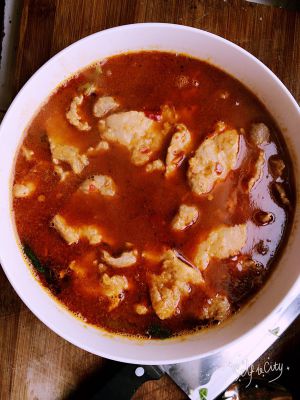 接着上一步,下肉片,不要让汤开锅温煮肉片至断生,捞出。