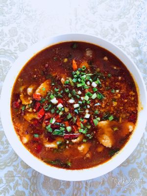 最后烫好肉片后连汤汁出锅,加少许油爆香花椒粒、蒜末、辣椒面浇到肉片上即可。