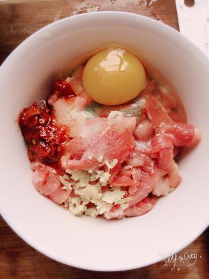 第二步:切好的肉放入盐,豆瓣酱,鸡粉,姜末,鸡蛋一个拌匀