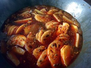 再起锅加油,放入事先准备好的葱姜蒜,干辣椒段,然后加入豆瓣酱,炒啊炒啊,多炒一会