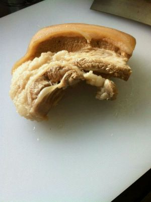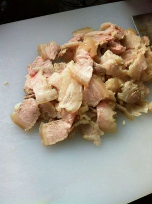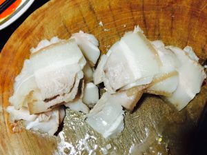 五花肉洗净整块放入锅中,锅中加入水与肉平齐,放入黄酒、生姜丝、整个干红辣椒去腥味。烧至变色用筷子可以刺穿即可出锅、凉干。