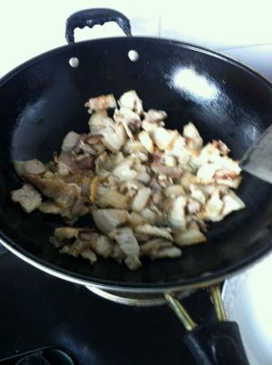 放少许油将蒜头,姜炒一下,放入五花肉炒