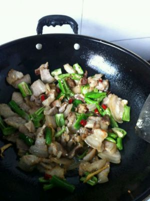 热锅倒油依次放入花椒.干辣椒.姜片.五花肉.炒出香味放料酒. 然后加入青椒.小米椒.蒜苗.接着加入酱油调色(酱油比较咸我就不放盐了)