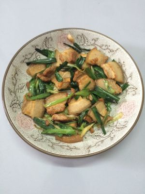 倒入酱油,料酒,盐翻炒,最后放入蒜苗炒后,盛入盘子,五花肉就好啦
