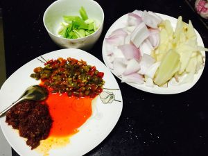 泡海椒、豆瓣(我用的自己做的豆瓣,色泽鲜艳、干净、鲜香、关键是不咸)子姜、洋葱、蒜苗。