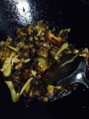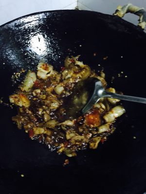 将泡海椒、豆瓣(两勺)、酱油(一勺)、白糖(一勺)和肉一起翻炒,注意用小火,如果肉爆得过干需加点水,闷五分钟