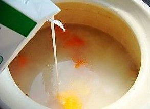 15分钟后加入青椒块,加盐,出锅前关火淋入原味鲜牛奶即可。