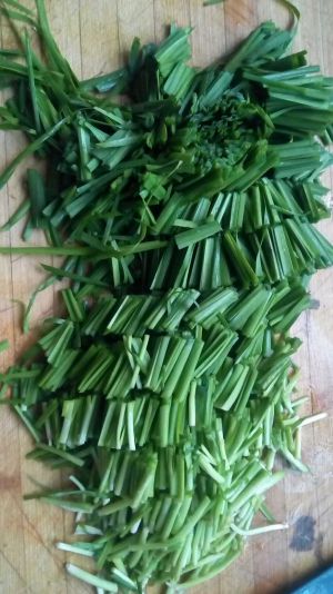 韭菜洗净,去根,切段儿,韭菜根要切短一点,比较容易好熟,韭菜切梢儿长一点。