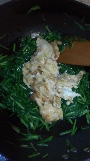 鸡蛋炒好后,放在锅里一边,这样鸡蛋不容易炒散。放入韭菜,变软就可以和鸡蛋一起炒,放盐、味精、一点点味极鲜酱油。继续翻炒两分钟。