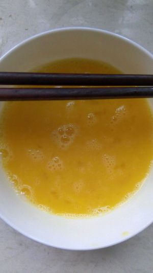 油热下鸡蛋,可以多放点油,油多鸡蛋可以容易气泡。大概炒成这样。