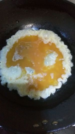 加入一勺油锅中,先把打散的加盐的鸡蛋,用小火做成鸡蛋饼。