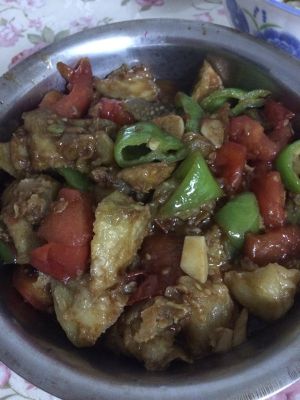 先把茄子切成块,然后裹面,接着就开始炸,炸到金黄色就捞出,然后倒入新油,放入葱和蒜,再放西红柿炒一会放青椒,倒入适量水,放盐,鸡精