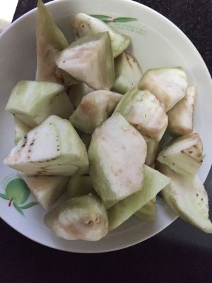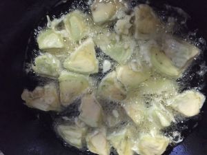 冷锅热油,茄子吃油,可多放一些。放入茄块,将茄子炸软。