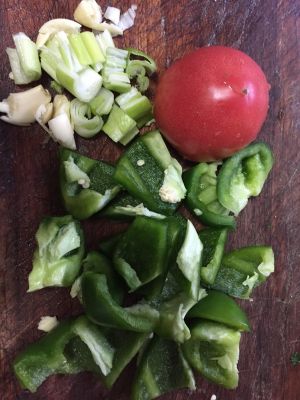 青椒洗净切块,黄瓜去皮切滚刀块,大葱切斜块