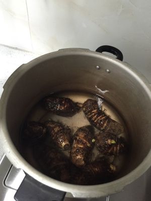 倒在高压锅内加点盐就可以煮了。放多少水就看自己喜欢汤一点还是怎么样。我是刚好没过芋艿。