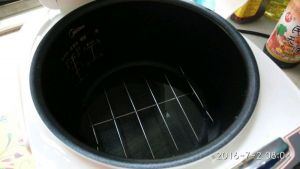 电饭煲中放上架子隔水炖。如果你没架子的话,那水要放少一点。以防止沸腾后的水进盆中。