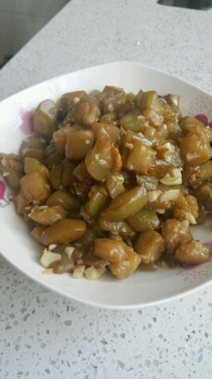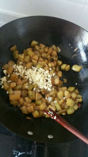 肉碎炒熟加茄子跟蒜末,水跟酱油