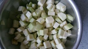 茄子洗净切滚刀块,四季豆去两头撕去筋洗净掰成两段,葱头切碎