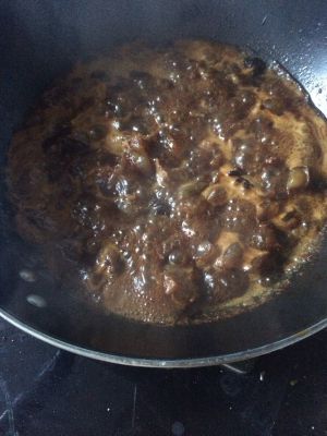 加2勺生抽,半勺老抽,半勺糖炒匀上色。加适量清水,适量盐炖煮一会儿,收干汁即可。