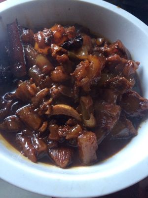 前面的忘记拍了,直接来煮的 新鲜牛筋买来洗干净血后,在高压锅里压熟微微烂(后面煮味道好煮一些),压好后的牛筋,切小块下油锅爆炒,加茴香八角桂皮,然后倒进料酒,生抽老抽和糖盐还有少量鸡精,最后加清水盖锅烧
