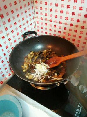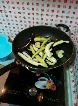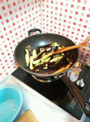 一直炒茄子,把茄子炒熟炒软,小心不要糊锅,找大块的茄子可以用铲子铲成小块。
