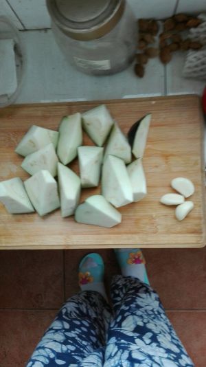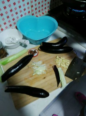 准备好食材,大蒜拍碎,大葱切丝,大料预备,茄子撕成条状。
