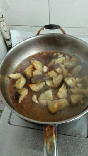 8、酱汁翻炒好后倒入煎炸好的茄子块迅速翻炒几下让每块儿茄子都挂上酱汁即可出锅(注意这个步骤一定要快)