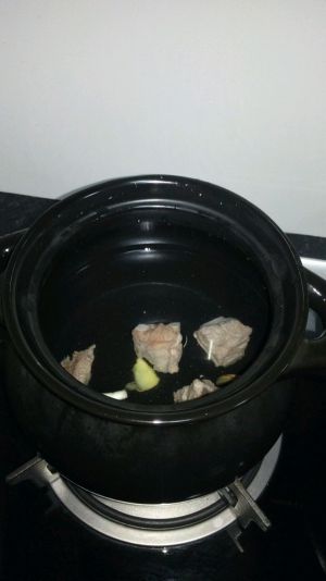 在砂锅中放入水和排骨,姜,大火煮开转小火,炖半个小时。