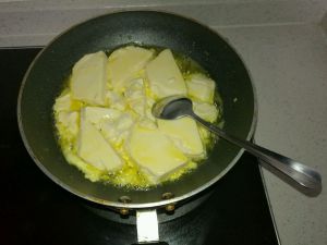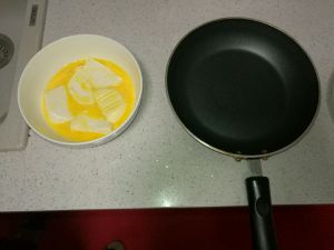加入橄榄油后,把裹好蛋液的豆腐,轻轻的温柔放入不粘小平锅内,摆放平齐