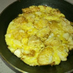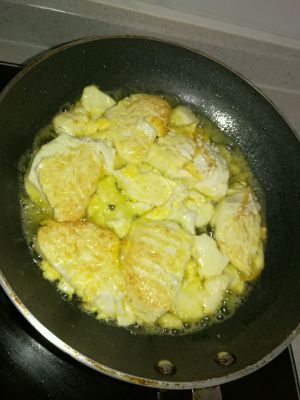 煎到金黄翻面,待到两面煎黄,就可以放入酱油,最后把剩下的蛋液,盘旋倒入,这样就可以形成焦酥蛋花