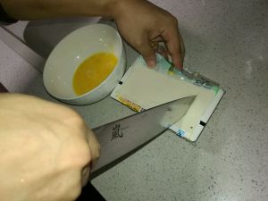 即可以直接反扣砧板上后,切块。也可以直接在盒里切块。关键注意砧板干净度。