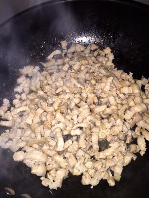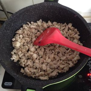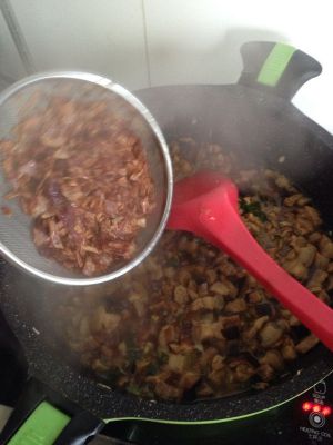 香菇不用盛出,锅中倒入肉丁,香菇水。