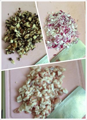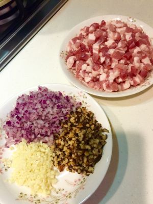 三层的带皮五花肉切成小于一厘米的小丁,紫洋葱、水发香菇、蒜瓣切碎末 (香菇水不要倒掉)