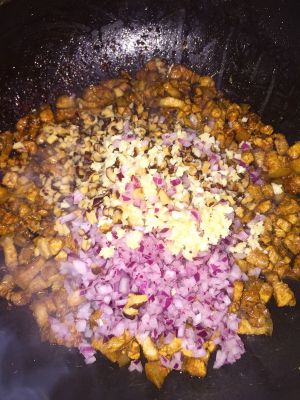 加入炸好的洋葱酥翻炒,继续加入香菇翻炒。