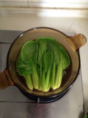 油菜洗净,对切成2份。锅内烧热水,放入油菜略微汆烫变色后捞出。