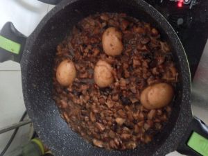 烹入适量上海黄酒、老抽增香上色,随后把洋葱、香菇、蒜末全部倒入锅中翻炒均匀。