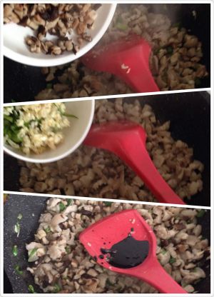 然后加入香菇丁翻炒;加入葱姜蒜末翻炒均匀;加入适量老抽、生抽和料酒。