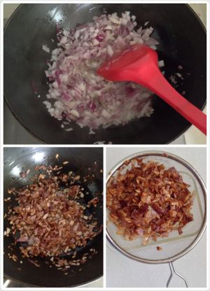 油适量,小火,加红葱头末,快炒,炸至金黄。不宜过老,会苦。