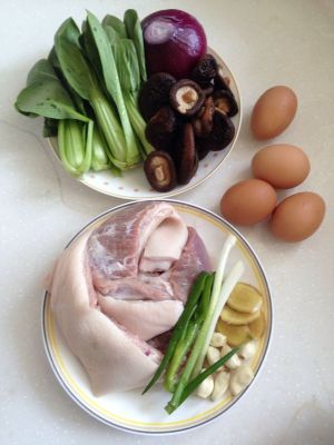 准备材料(香菇干要提前泡好) 主料:五花肉1斤、红洋葱1个、香菇干12朵、鸡蛋4个、油菜适量 配料:葱适量、姜适量、蒜适量、八角1个、香叶3片、桂皮1片、冰糖适量、食盐适量、老抽少许、生抽适量、料酒适量