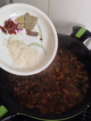 加入冰糖、八角、桂皮和香叶。台式的卤肉饭回甜,所以冰糖可以稍微多一点,根据口味加入适量的盐。
