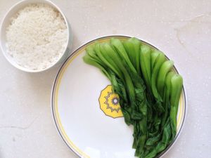 米饭装入碗内压实,盘中摆上几根汆烫好的油菜。