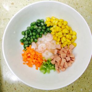锅内倒入油,加入玉米粒、青豆、火腿肠、虾仁翻炒