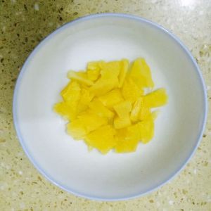 将买回的菠萝切小块盐水泡一泡,待用