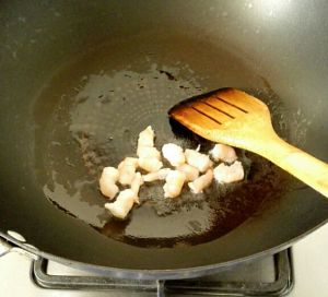 油锅烧热,下油,先把虾仁煸炒一下,取出